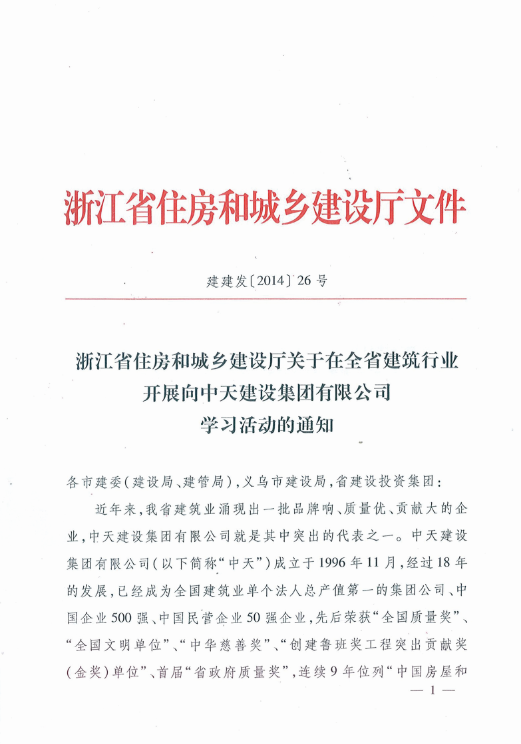 《浙江省住房和城乡建设厅关于在全省建筑行业开展向利来w66建设集团有限公司学习活动的通知》